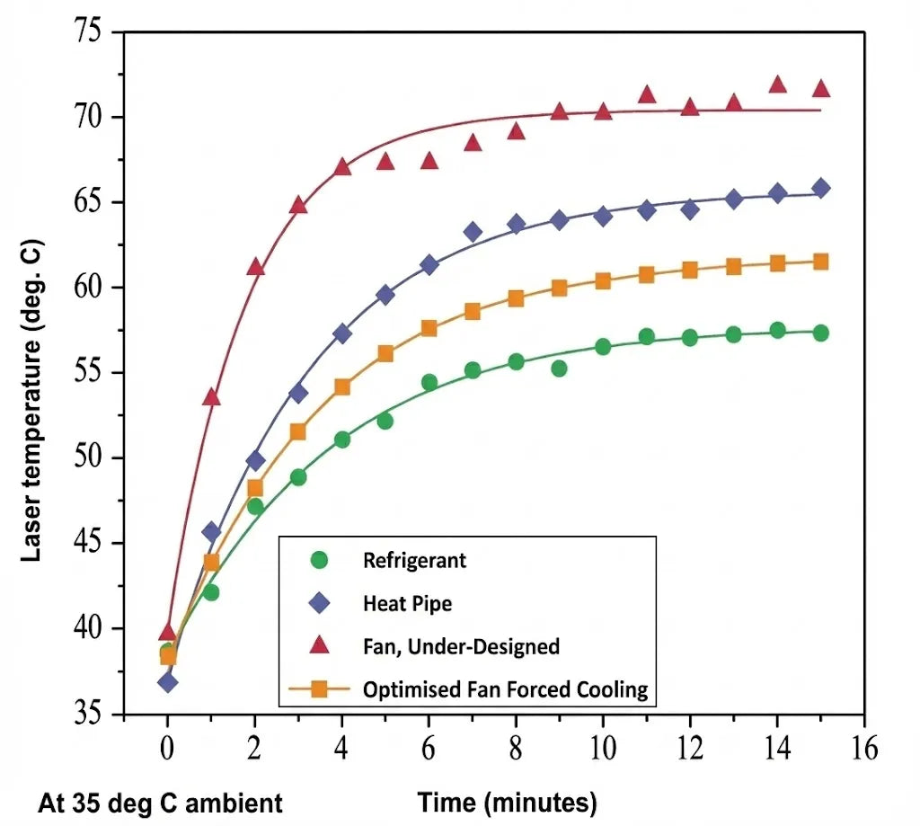 2. Ensuring the air flow is adequate to minimise the temperature differential. If air flow is halved, the temperature of the air must approximately double, and the device being cooled will run much hotter. We have seen many cheap Chinese lasers with inadequate fan sizes and flow rates.